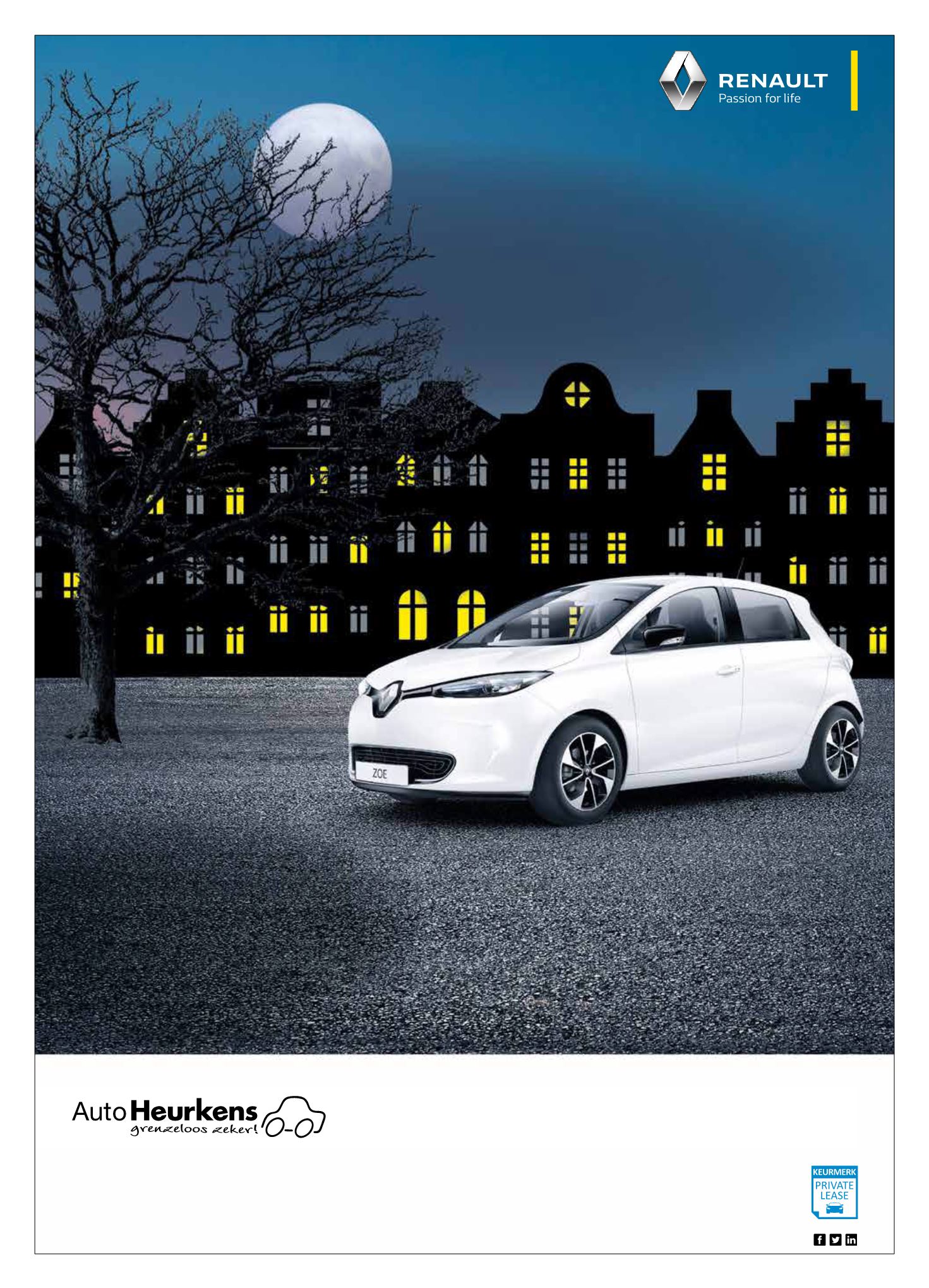 afschrijving & rente, btw en administratiekosten. Maandbedrag gebaseerd op de Renault ZOE R90 Z.E. 40 Life. De max. meerkilometerprijs per km bij vanaarief ZOE is € 0,0979. Renault Private Lease is onder voorbehoud van