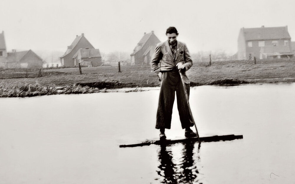 De voorste schaatser, maar ook de waaghals op de volgende foto, die op de Begijnenpeel aan het ‘surfen’ is, is Wiel Heussen. Zijn tweelingbroer heette Harrie. Enkele jaren na WO II moest een van beiden in militaire dienst. Er kwam een gemeenteambtenaar met Graad en Cisca overleggen wie van de twee de dienstplicht moest vervullen. Zij konden zelf geen keuze maken. Daarop vroeg de dienstplichtambtenaar wie het eerste was geboren? Dat was Harrie. ‘Dan moet Wiel in dienst’, zei de ambtenaar. ‘Waarom dat?’ vroeg Graadje. ‘Nou Graad’, zei de ambtenaar, ‘bij het aardappelen rapen, komen de aardappelen die je als laatste in de mand gooit er ook als eerste uit’.